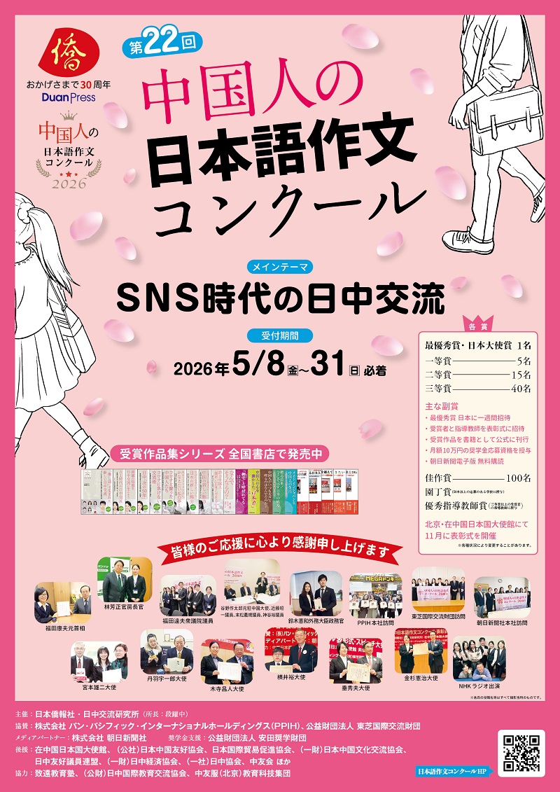 「私の日本語作文指導法」 中国で日本語教育に携わっている教師の皆さまを対象に、「私の日本語作文指導法」(2000〜3000字)のご寄稿を募集いたします。 ※「中国人の日本語作文コンクール」の指導教師以外の方もご応募いただけます。 ご応募いただいた原稿は審査のうえ、その年の受賞作品集に収録するか、作文コンクール公式ホームページに掲載いたします。 形式: Wordファイル 締切: 2026年9月6日(日)必着