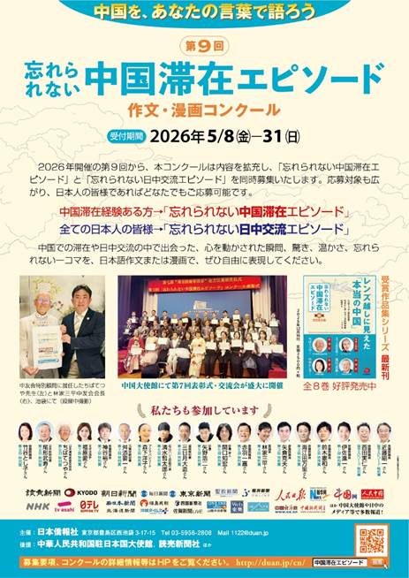 日本僑報社(所在地:東京都豊島区、代表:段躍中)は、第9回「忘れられない中国滞在エピソード」作文・漫画コンクールの募集要項を、2026年1月7日に正式発表しました。 募集要項全文http://duan.jp/cn/vol9-taizai/2026.htm 本コンクールは、中国での滞在経験や日中交流を通じて生まれた、忘れがたい体験や心を動かされた出来事を、日本語の作文または漫画で表現してもらうことを目的としたもので、これまで8回にわたり開催されてきました。 ■ 第9回から内容を拡充 第9回となる今回は、従来の「忘れられない中国滞在エピソード」に加え、「忘れられない日中交流エピソード」を新設。中国滞在経験の有無を問わず、すべての日本人を応募対象とし、より幅広い体験や視点を募集します。 •中国滞在経験者:「忘れられない中国滞在エピソード」 •すべての日本人:「忘れられない日中交流エピソード」 ■ 応募作品の受付期間 •2026年5月8日(金)〜5月31日(日) ■ これまでの開催実績 本コンクールは2017年にスタートし、学生、会社員、主婦、研究者、企業人、文化人、政治家など、全国から多数の応募が寄せられてきました。受賞作品は毎回書籍として刊行され、受賞作品集は現在までに全9巻(2017年刊行の『日中対訳 忘れられない中国留学エピソード』を含む)を発行。日中相互理解を深める貴重な記録として高い評価を得ています。また、中国駐日本国大使館において表彰式・交流会が開催されるなど、日中交流事業としての実績も積み重ねてきました。 ■ 主催者コメント 「一人ひとりの体験や言葉には、国と国をつなぐ力があります。第9回では、より多くの方の“忘れられないエピソード”を通じて、日中交流の輪が広がることを期待しています。」 ■ 主催・後援・協力 •主催:日本僑報社 •後援:中国駐日本国大使館、読売新聞社、日中友好議員連盟、日中友好協会、日中協会、日中文化交流協会、日中経済協会、日本国際貿易促進協会ほか •協力:中友会、日中青年交流の会、漢語角 ■ 詳細・応募方法・お問合せ先 募集要項の詳細、応募方法については、下記公式サイトをご覧ください。 事務局: 171-0021東京都豊島区西池袋3-17-15湖南会館 Tel 03-5956-2808 Fax03-5956-2809 info@duan.jp 担当:張本、南 |