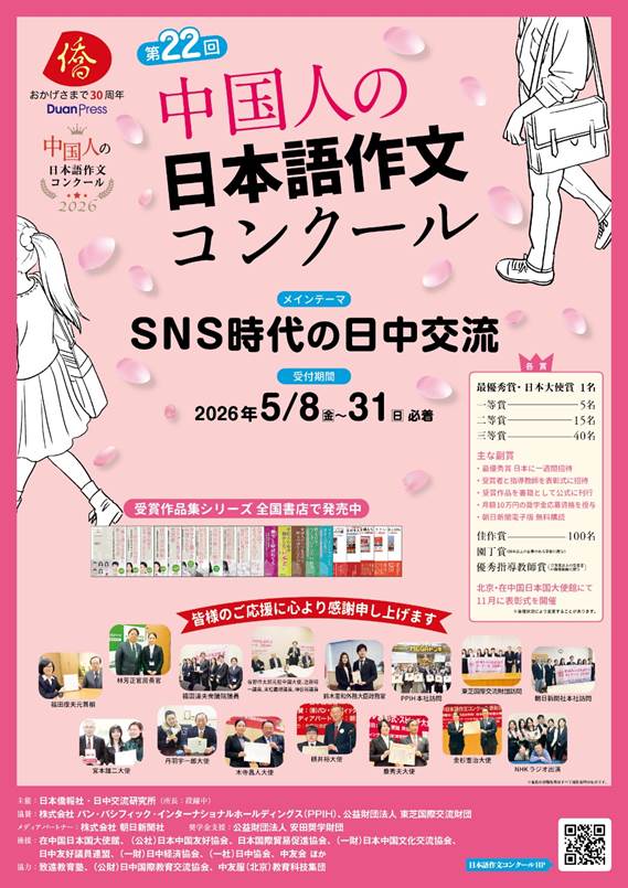 サポーター募集─中国人の日本語作文コンクール 若者の声が日中交流の未来を拓く 東京都豊島区の日本僑報社・日中交流研究所(所長・段躍中)は、2005年の創設以来、日中民間交流の重要な文化教育事業として展開してきた「中国人の日本語作文コンクール」において、2026年度の開催に向けたサポーターの募集を開始しました。 本コンクールは、中国国内で日本語を学ぶ学生・若者を対象に、日本語による作文という表現の場を提供することで、相互理解と文化交流の深化を目指すプロジェクトです。これまで中国全土の多くの大学・教育機関から多数の応募が寄せられ、累計応募者は6万人にのぼるなど、規模と影響力を有する交流プログラムとして評価されています。 現在、日中関係の悪化により、中国国内における日本語教育を取り巻く環境は厳しさを増しています。そのため、作文コンクールの開催や応募者の確保には、民間の支援と協力がこれまで以上に必要とされています。こうした状況を受け、本年度は「サポーター制度」を設け、個人・団体・企業など幅広い支援者を募集することになりました。 サポーターとしての協力内容は、応募者募集に関する告知支援やイベント後援、作品集の発行支援、受賞者招聘行事への協力など多岐にわたります。サポーターの参加は、単なる寄付にとどまらず、若者たちの学びと発信の機会を守る社会的な共働として位置づけられています。 日本僑報社・日中交流研究所は、「日本語を学ぶ中国の若者が自らの視点で世界を語ることは、日中相互理解の基盤を育むもの」と位置づけ、長期にわたる交流の価値を訴えています。作文を通じて育まれる表現力や異文化理解は、両国の未来に向けた信頼関係の構築を支える可能性を秘めています。 サポーター募集の詳細および本コンクールの応募要項・テーマなどは、公式サイトで随時発表されています。関心のある個人・団体の参加が広く呼びかけられています。 詳しくは公式ホームページをご覧ください:http://duan.jp/jp/cs.htm |